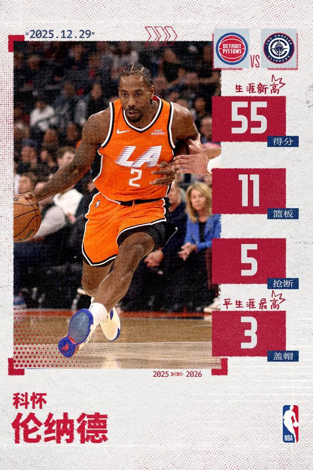 伦纳德55分&单节26分创生涯新高 追平快船队史单场得分纪录