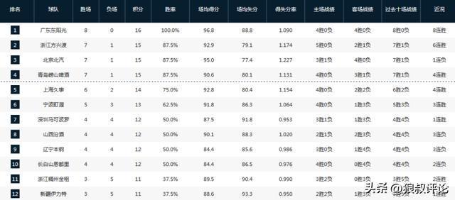 CBA最新排名:广东8战全胜高居第1,辽宁跌至第8,北京队赛季首败