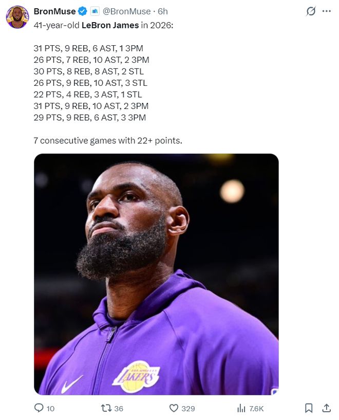 勒布朗年满41岁后他七场比赛里只有一场没有超过25+,其中还有三场30+,如此努力的老头真的应该背锅吗?这7场比赛湖人3胜4负战绩的确不佳。