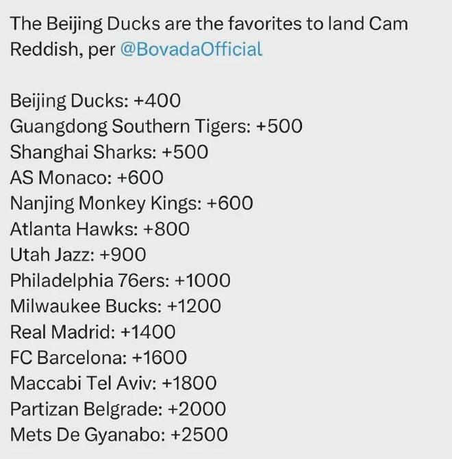 去年初曾有美媒预测了雷迪什新下家赔率,竟然是北京队、广东队和上海队分列前三,具体如下: