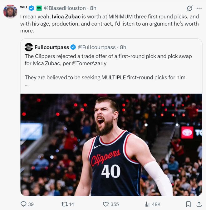 休媒Will转推后写道:我认为祖巴茨至少值得三个首轮签,考虑他的年龄、表现、合同情况,我认为会有球队觉得他值得这样的代价,但我持保留意见。