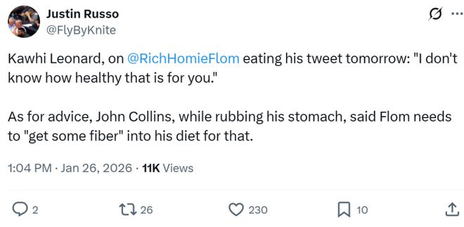 球迷打赌后要吃推文!伦纳德:还是吃点别的吧,那玩意儿对身体不好