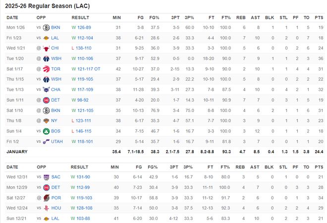 2026年01月26日 快船全员均得分主场37分大胜篮网!小卡28+5 哈登三节19+6+8
