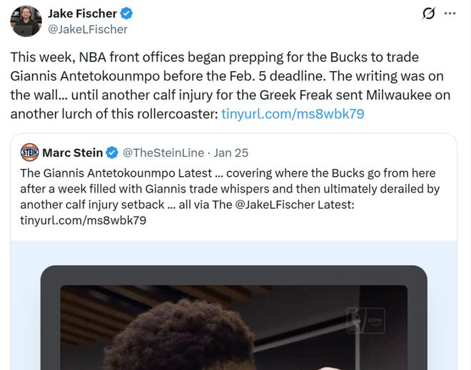 消息来自于美媒《The Stein Line》名记Jake Fischer对于字母哥潜在价值的长文分析。