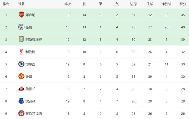 随着阿森纳4-1维拉+曼联1-1爆冷!英超最新积分榜:切尔西掉队