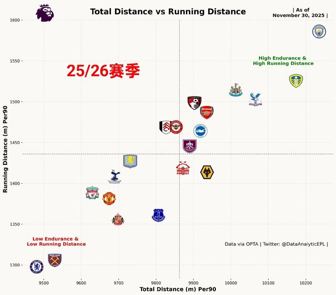 从本赛季英超球队跑动质量来看,切尔西的冲刺跑距离和总跑动距离都是倒数第一,当然这一点跟球队频繁拿到红牌,相当一部分比赛10打11有关,导致数据平均时变少(总数据是10人作战,平均时依旧除以11人)。