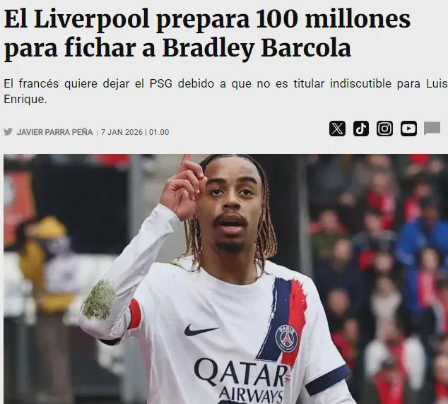 据Fichajes透露,利物浦对巴尔科拉很感兴趣,这位法国边锋因近几个月出场机会寥寥而准备离开巴黎。尽管巴黎方面不愿放行——他与俱乐部的合同到2028年才到期。但利物浦准备提出一份1亿欧元的正式报价,以说服法甲豪门放人。据悉球员本人“非常渴望”加盟斯洛特麾下。