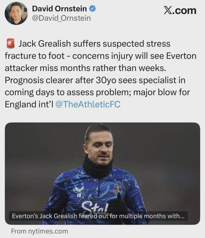 此外,这次足部应力性骨折也打乱了格拉利什的个人计划。这位出自维拉青训、从曼城租借而来的边锋,原本希望借助在埃弗顿的表现重返英格兰国家队。但随着骨折伤病的出现,格拉利什很难赶上明年3月份的国家队比赛日,这也意味着他将基本缺席2026年的美加墨世界杯。