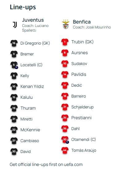 尤文vs本菲卡:伊尔迪兹、乔纳森-戴维首发,坎比亚索出战