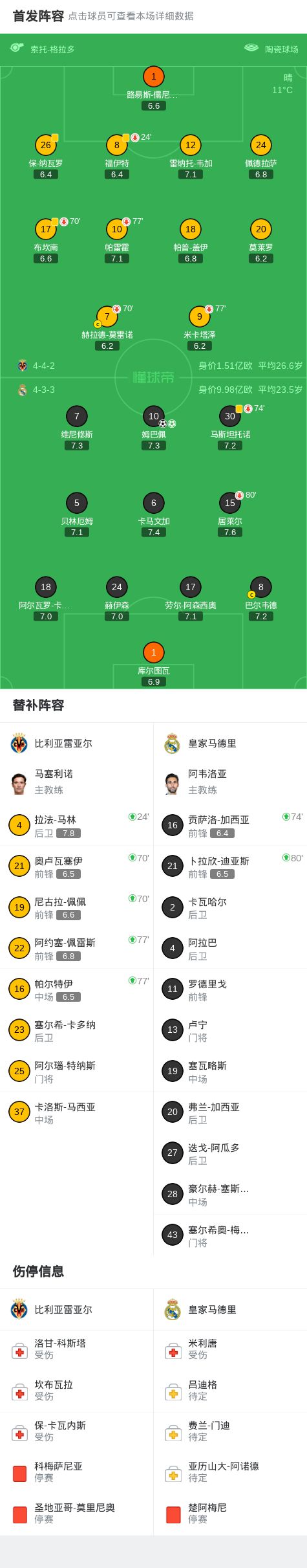 北京时间1月25日,西班牙足球甲级联赛第21轮,比利亚雷亚尔主场对阵皇家马德里。上半场居莱尔、维尼修斯打门造险,下半场姆巴佩捡漏破门,莫雷诺失必进球,姆巴佩造点并亲自主罚命中。最终,比利亚雷亚尔0-2不敌皇家马德里。