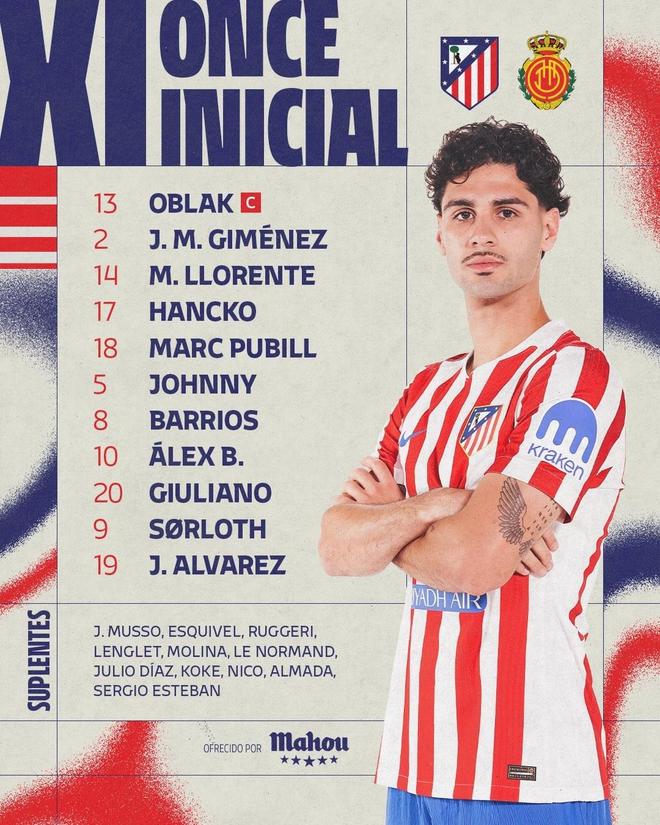 马竞vs马略卡:阿尔瓦雷斯、瑟洛特领衔首发,科克替补
