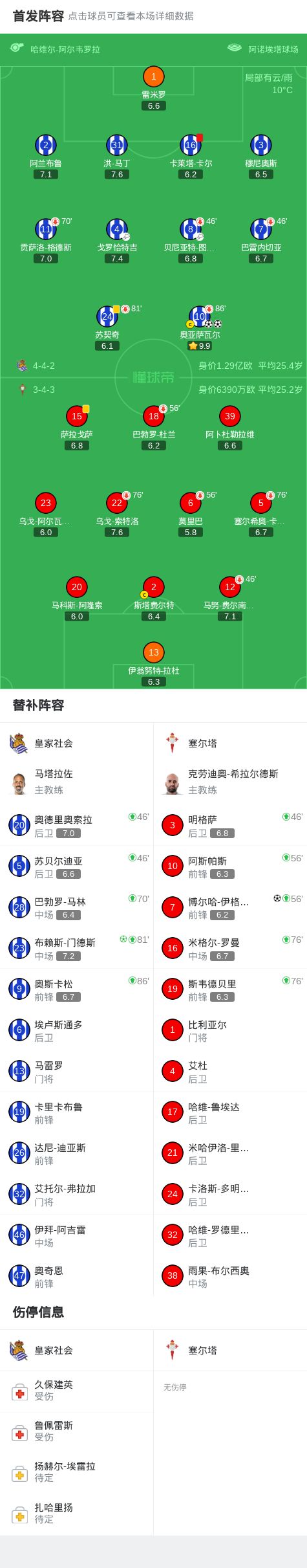 北京时间1月26日,西班牙足球甲级联赛第21轮,皇家社会主场对阵塞尔塔。奥亚萨瓦尔接贝尼亚特-图连特斯助攻破门,为皇家社会首开纪录;上半场补时阶段,卡莱塔-卡尔被罚下场;易边再战,博尔哈-伊格莱西亚斯扳回一球;随后奥亚萨瓦尔再度破门,戈罗恰特吉送出助攻;比赛最后阶段,布赖斯-门德斯主罚点球命中。最终皇家社会3–1战胜塞尔塔。