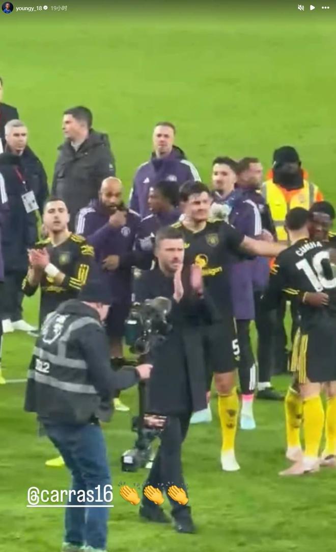 比赛前后,阿什利-扬晒出了自己在酋长球场观看比赛的照片和视频,并配文:“客场之旅:曼联,曼联,曼联!” 可以看到,他坐在酋长球场的客队球迷区。比赛结束后,他还在社交媒体上向卡里克表示祝贺。