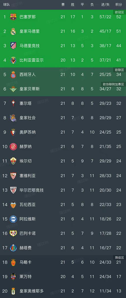 5分钟后皇家奥维耶多还是失误,拉菲尼亚单刀破门,第73分钟亚马尔锦上添花,最终巴萨3-0全取三分,积分上涨到52分,继续领跑,只不过只领先皇马1分,榜首的位置不稳。皇马本轮在客场凭借姆巴佩的双响,2-0战胜了比利亚雷亚尔,各条战线迎来三连胜,积分上涨到51分。比利亚雷亚尔遭遇赛季第5场败仗,以41分暂列第4名,已经落后了前两名至少10个积分,撼动皇马和巴萨的位置非常低。
